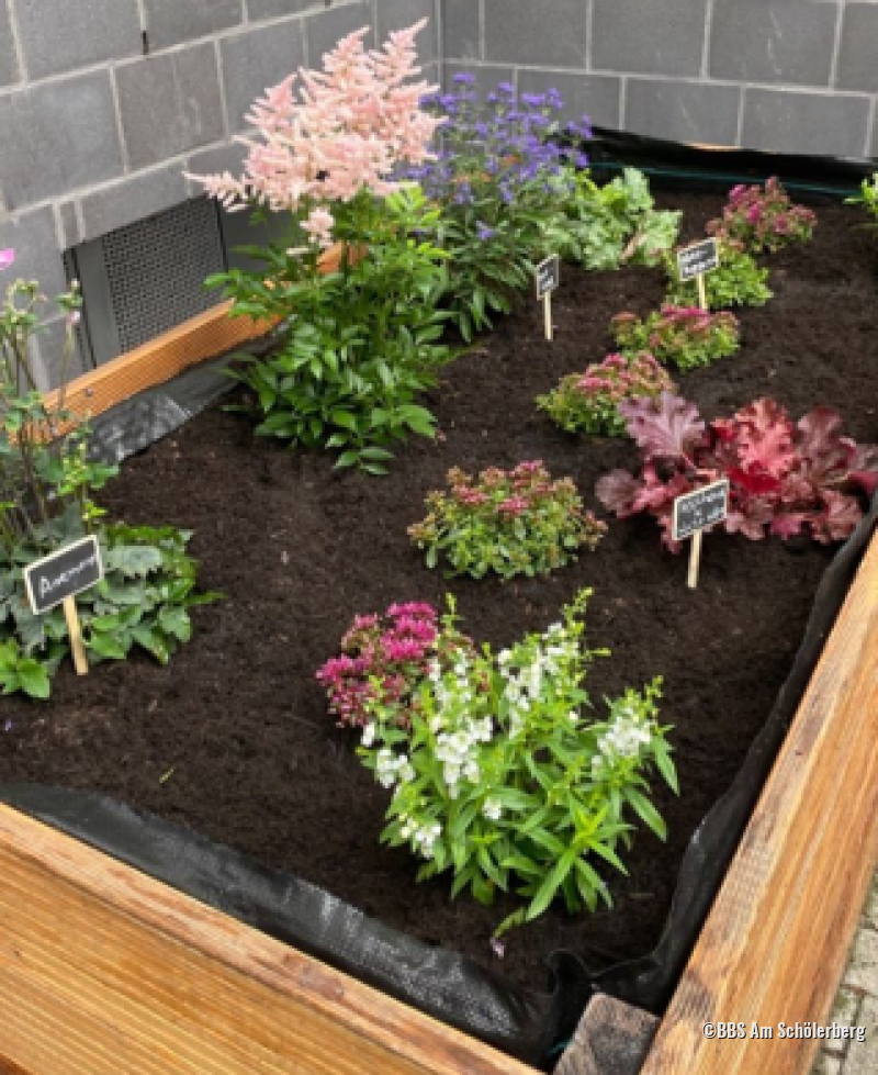 Vor wenigen Jahren konnten wir bereits ein Hochbeet auf dem Schulhof aufstellen, sodass Kräuter, Gurken und Radieschen in der Sommersaison geerntet werden konnten. Die Herbstbepflanzung ist von Schülerinnen und Schülern der Berufsfachschule übernommen worden, sodass auch hier insektenfreundliche Stauden das Hochbeet in der Nebensaison bereichern. Weiterhin wird die Zusammenarbeit mit der schulischen Cafeteria angestrebt, damit die eigenen Produkte aus dem Hochbeet auch auf den verkauften Brötchen verarbeitet werden.