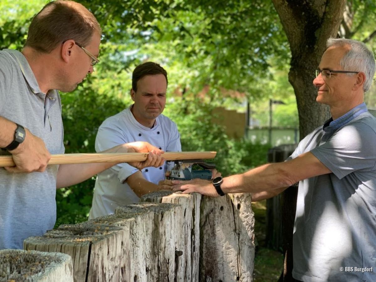 Auch der in die Jahre gekommene morsche Zaun konnte gemeinsam mit einer ukrainischen Integrationsklasse ausgebessert werden. Dazu wurden unbehandelte und wetterbeständige Lärchenhölzer auf Maß gesägt und von den Schülerinnen und Schülern gemeinsam mit ihren Lehrkräften neu verschraubt, sodass wieder ein intakter Zaun zum Schutz des Küchengartens entstand.
