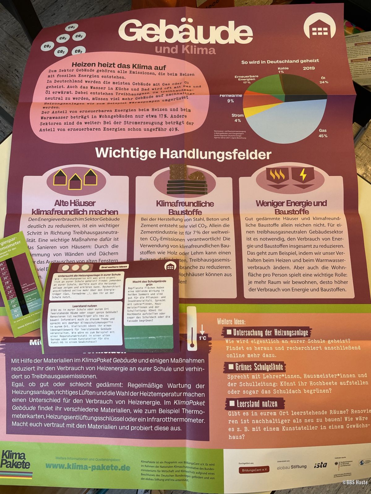 Unsere Schule nimmt erstmals an dem Programm KlimaPakete von dem Verein Bildungs Cent e.V. teil. Die Klimapakete enthalten vielfältige Informationen und zeigen Handlungsmöglichkeiten zu den Zielen und Herausforderungen der Treibhausgasminderung in den fünf Sektoren auf: Land- und Forstwirtschaft, Industrie, Verkehr, Gebäude und Energie. Die konkreten Handlungsideen und Aktionen sind eng mit der Lebenswelt junger Menschen verknüpft. Unsere SchülerInnen werden befähigt, aktiv an der Gestaltung mitzuwirken und so die Erreichung der Treibhausgasneutralität 2045 aktiv zu unterstützen.